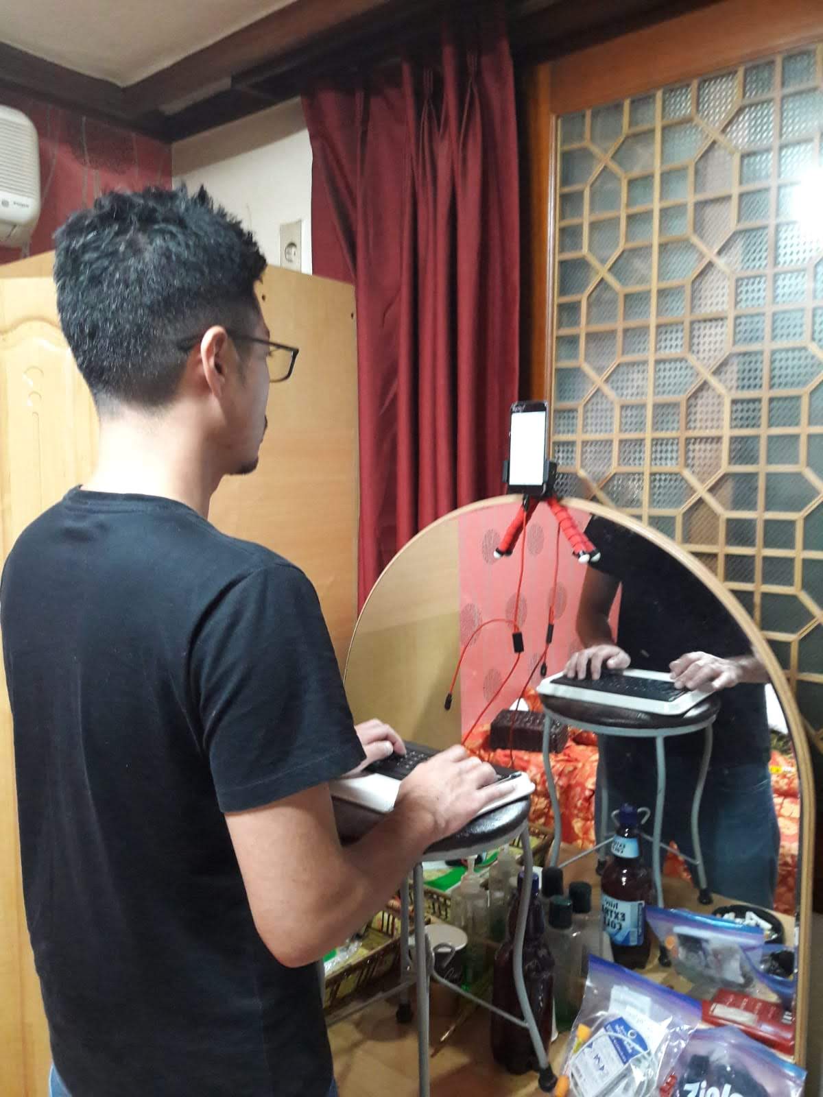 鏡の前に立ったまま作業する、即席スタンディングデスクの完成です。